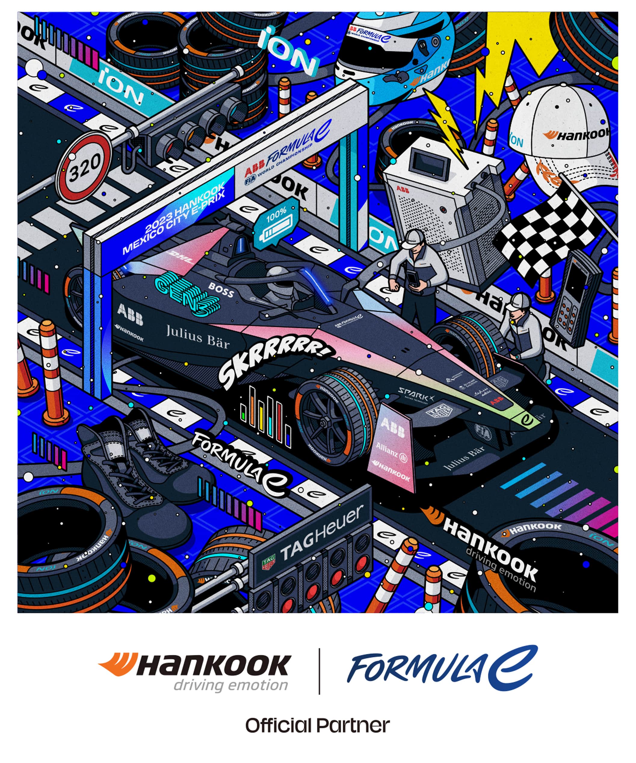 협업은 생동감 넘치는 포뮬러 E 레이싱 트랙을 배경으로 ‘한국(Hankook)’ 브랜드와 전기차 레이싱 타이어 ‘아이온(iON)’을 구현한 것이 특징이다. 한국타이어는 포뮬러 E를 통해 글로벌 전기차 타이어 시장에서 차별화된 한국타이어의 프리미엄 브랜드 가치를 전 세계 소비자에게 알리고 있다.